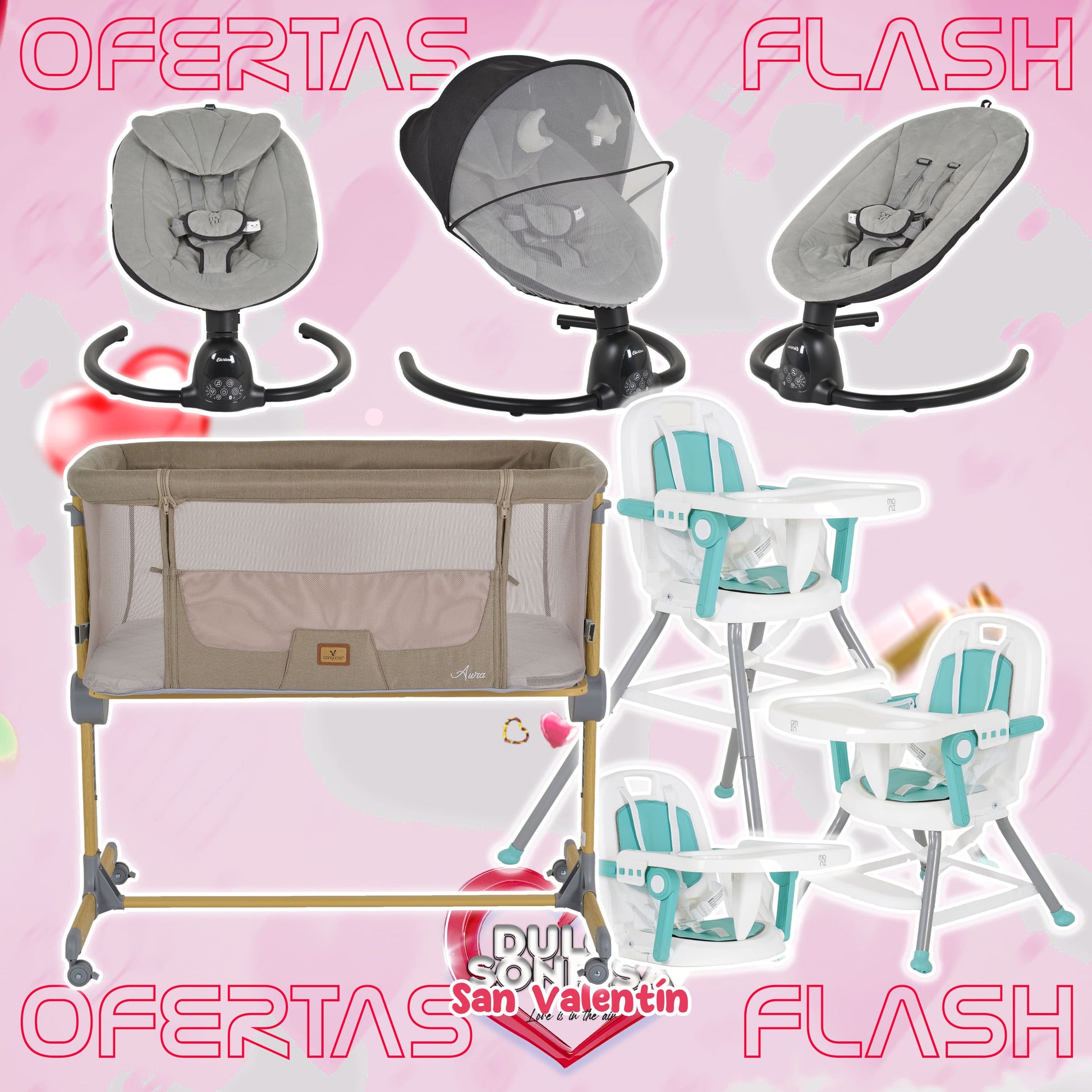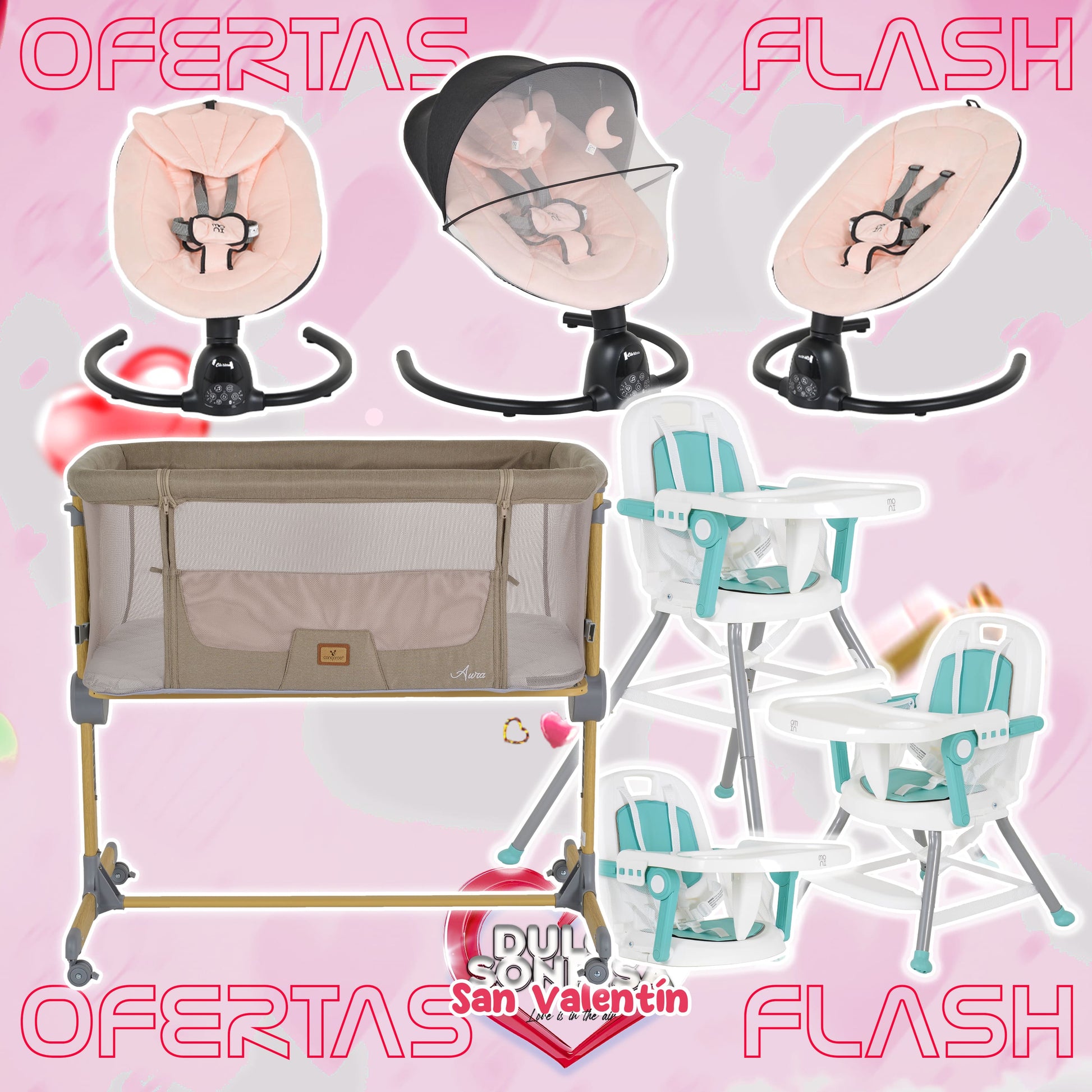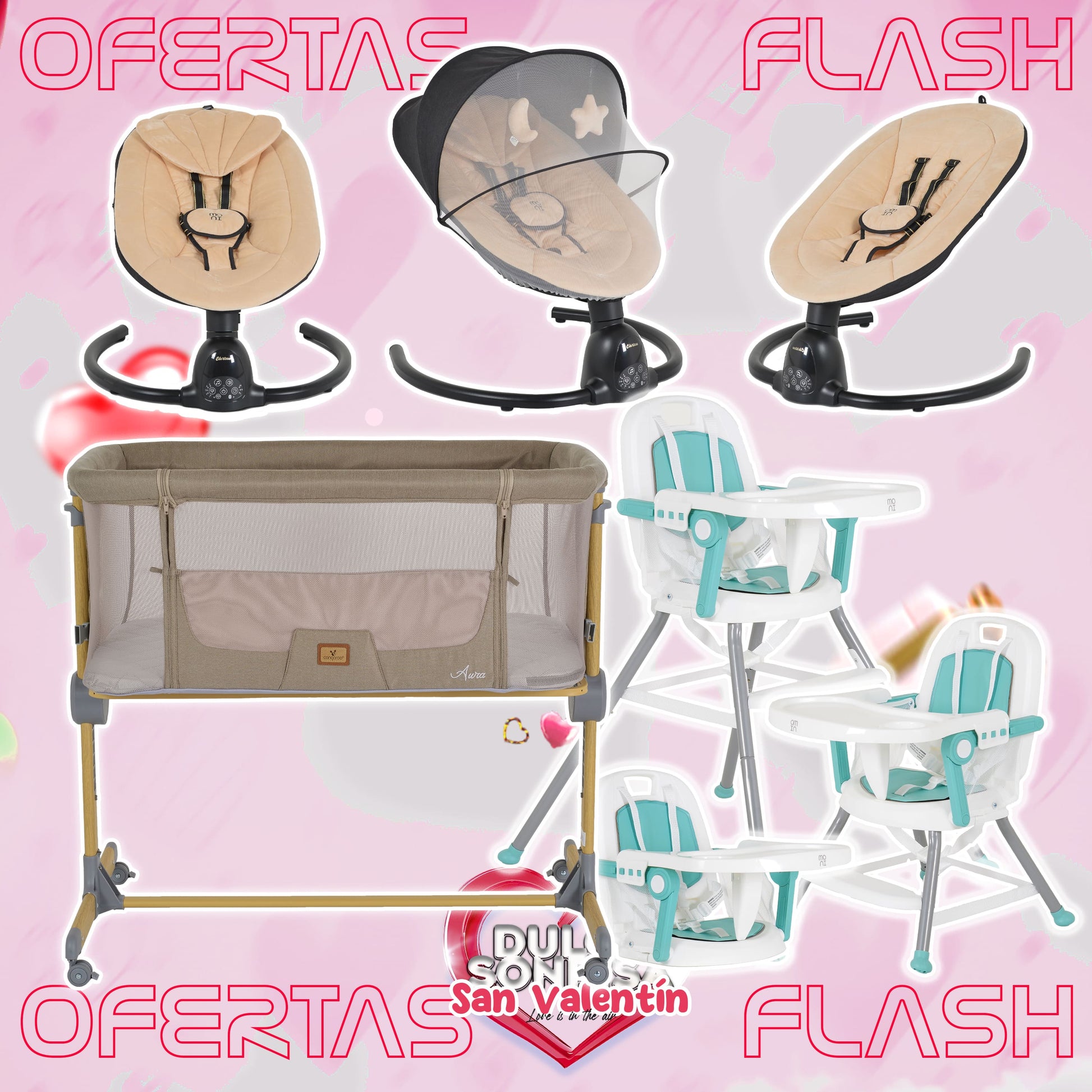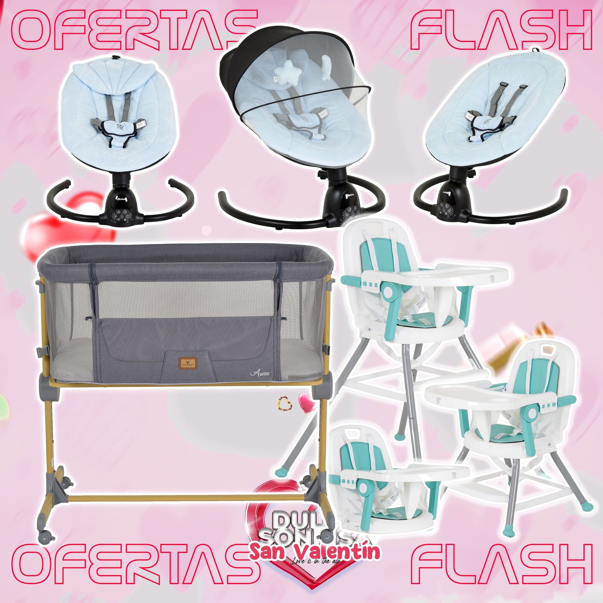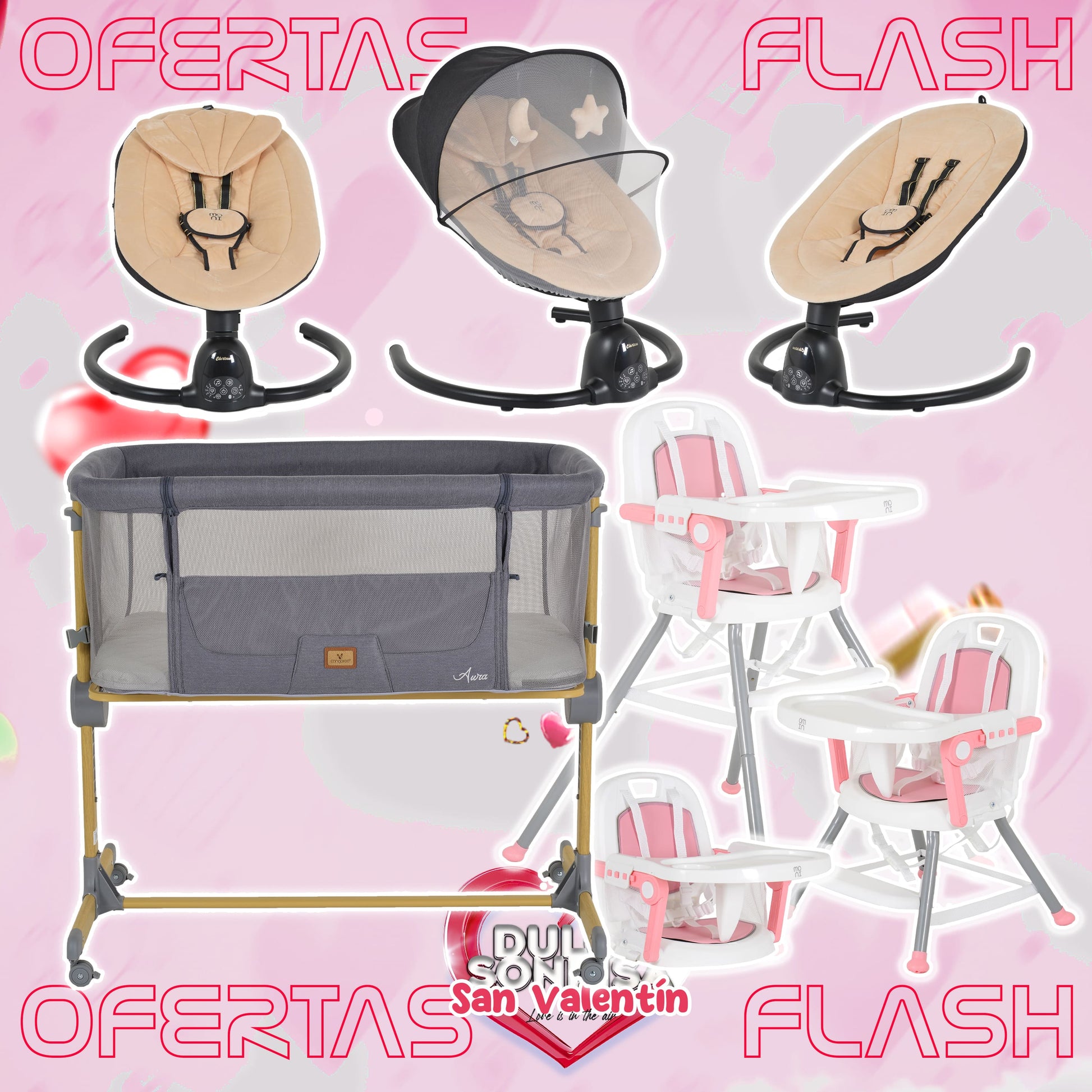 Lote San Valentin Nº5: Hamaca CLARISSA + Minicuna AURA + Trona AMARETTI