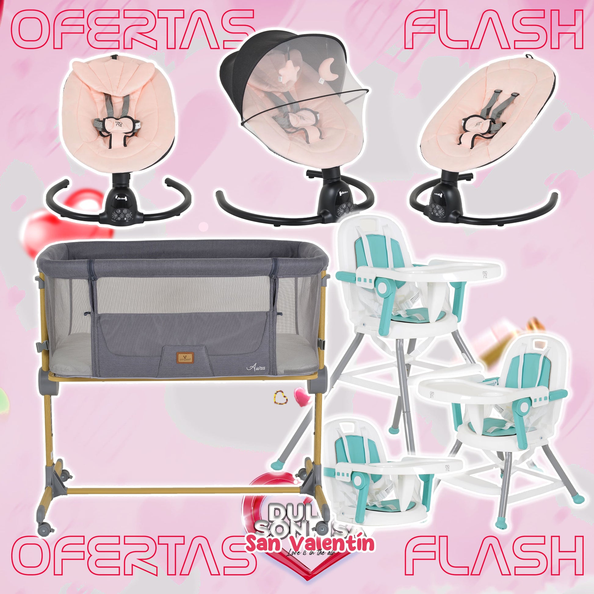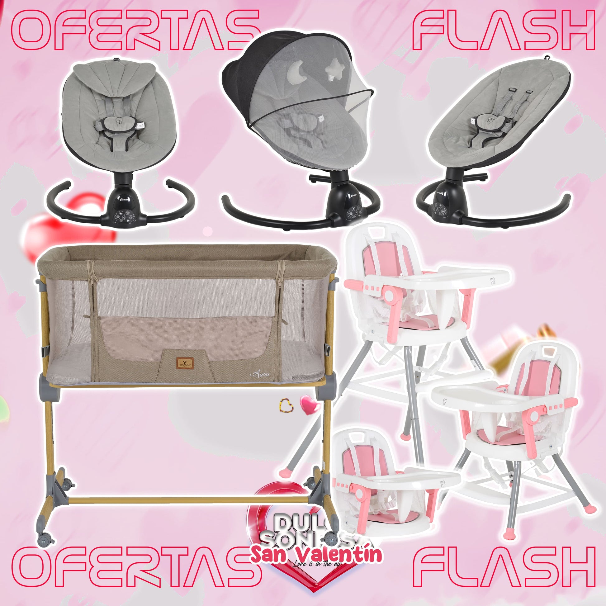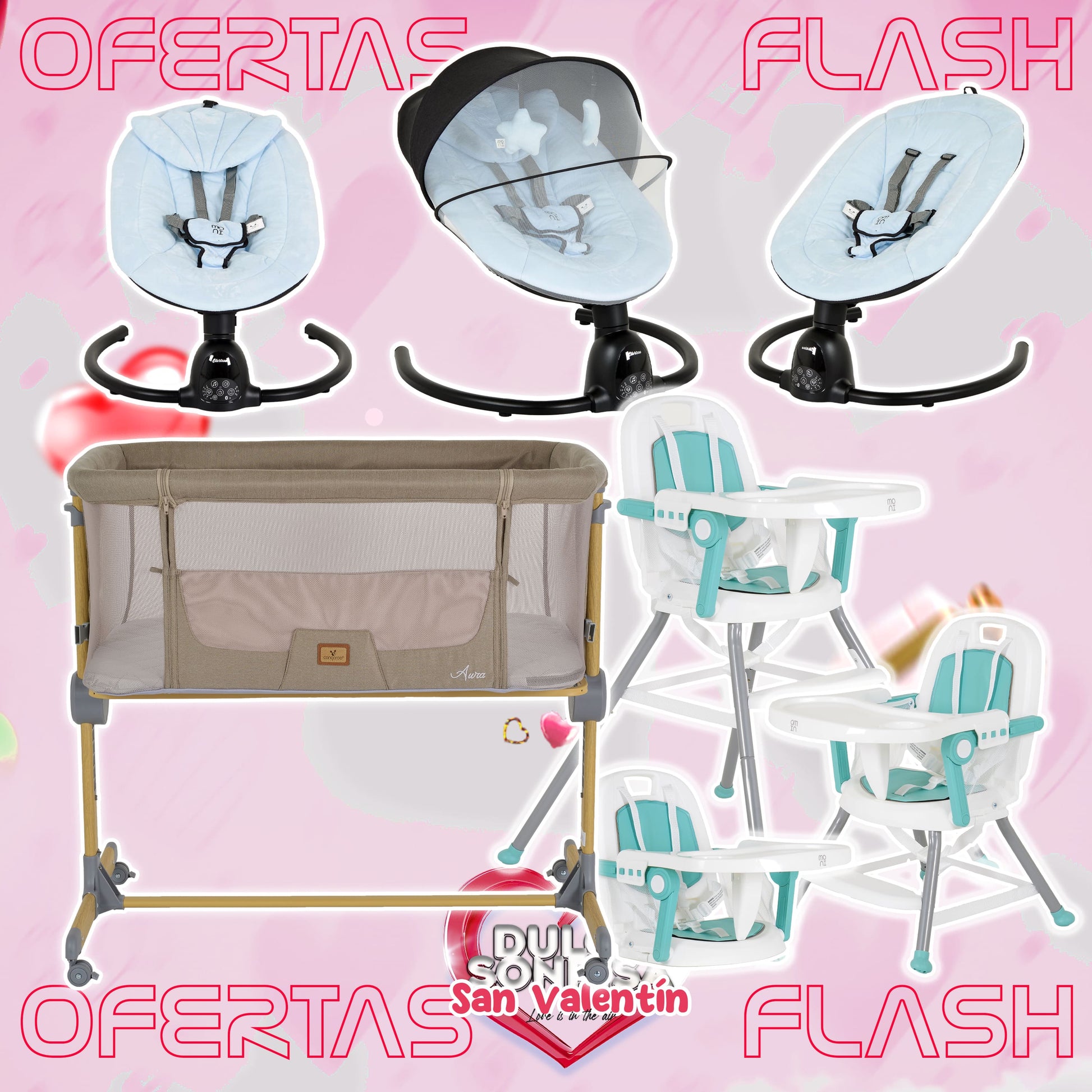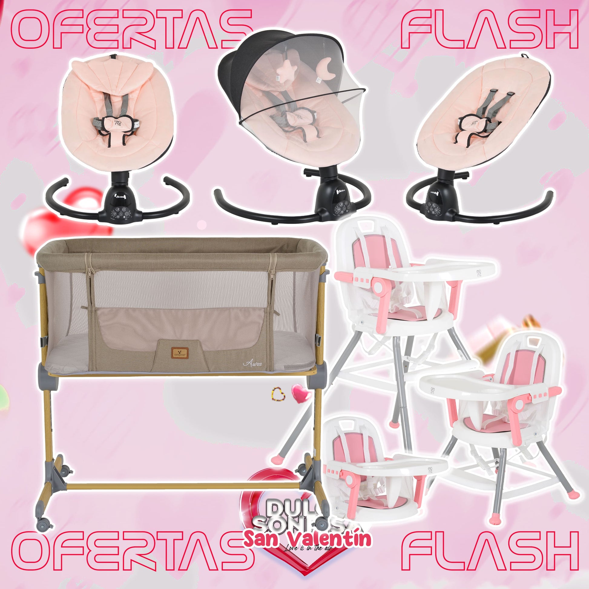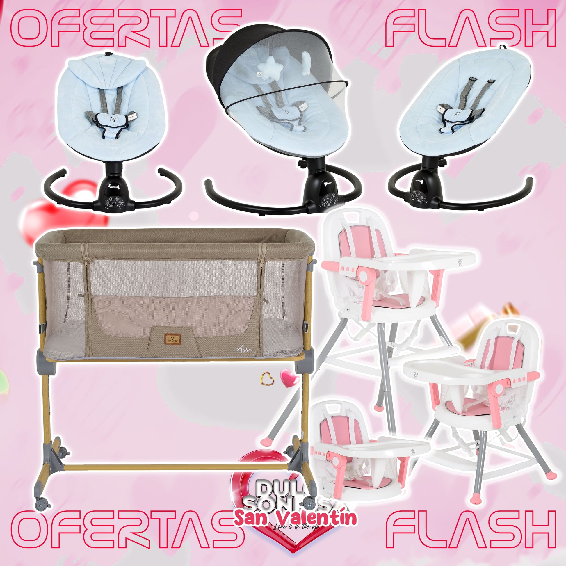 Lote San Valentin Nº5: Hamaca CLARISSA + Minicuna AURA + Trona AMARETTI