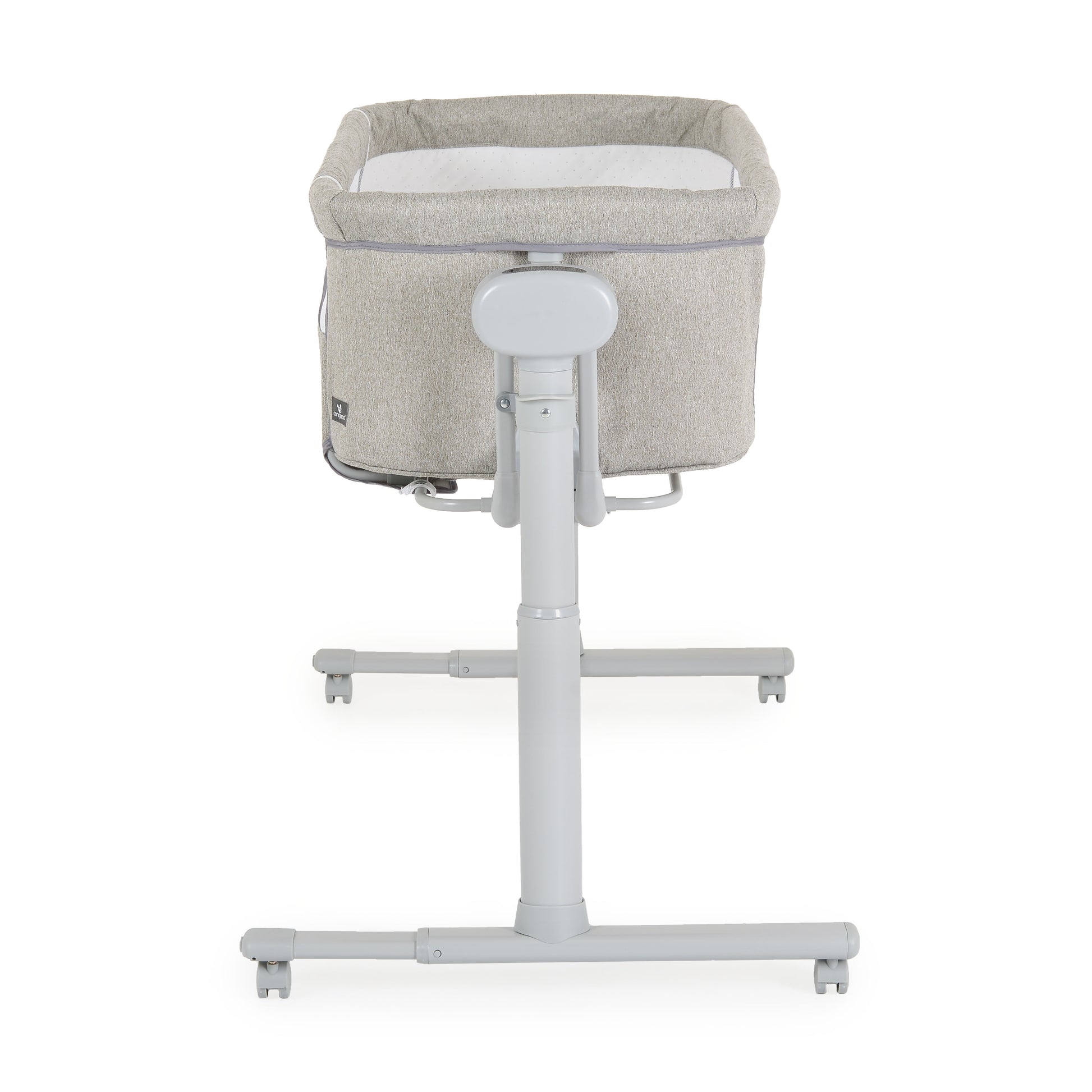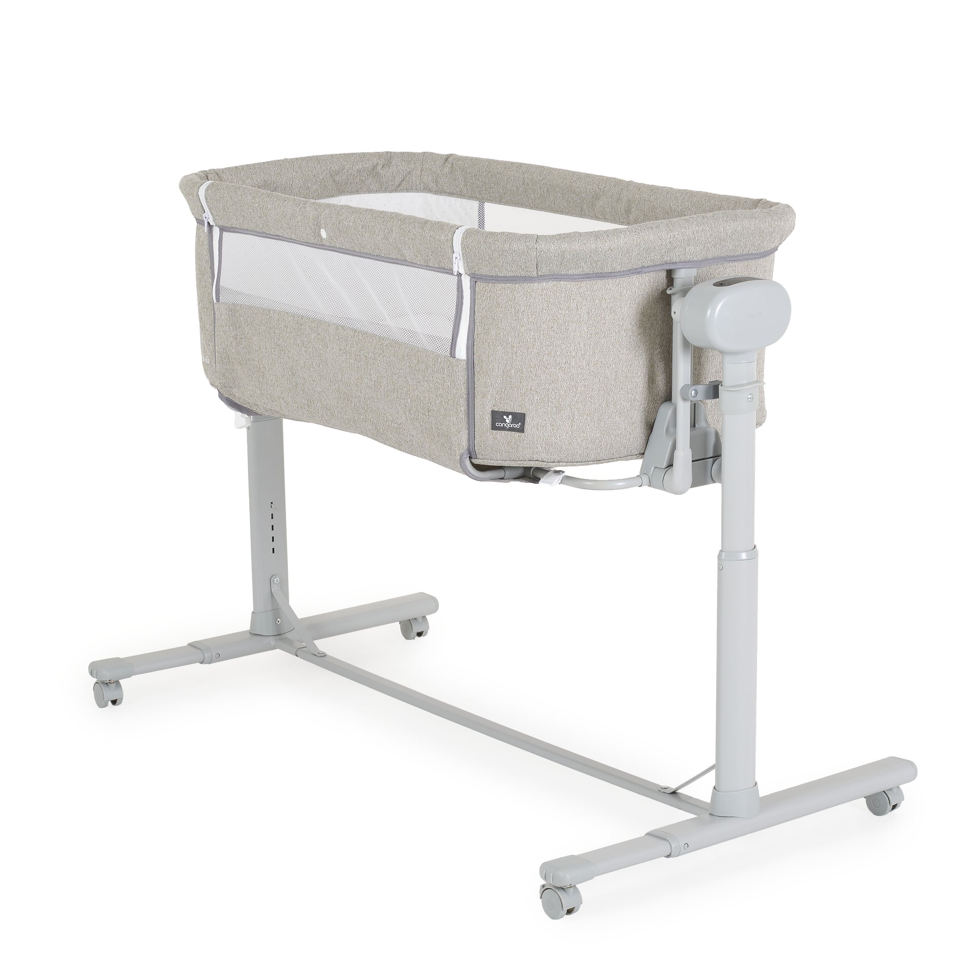 La minicuna cuenta con altura regulable en 5 posiciones, 4 ruedas con freno, laterales de malla para una ventilación óptima y un colchón con base firme y funda extraíble (84 × 46 × 2 cm). Las patas delanteras pueden plegarse para un acople estable a la cama de los padres.